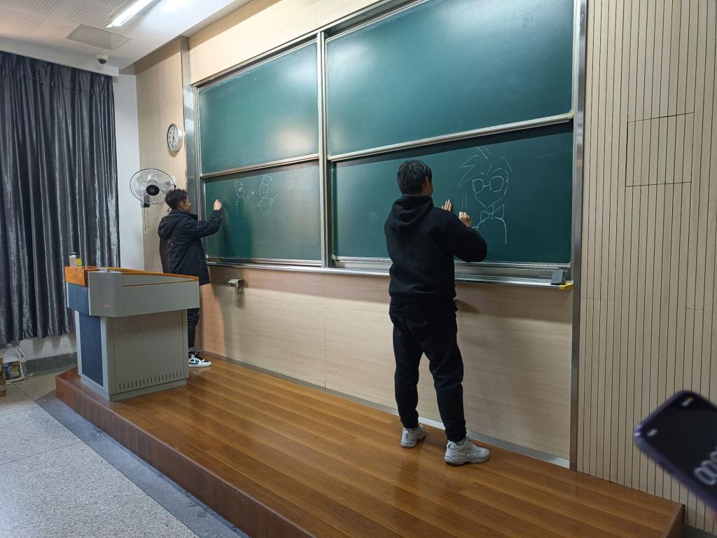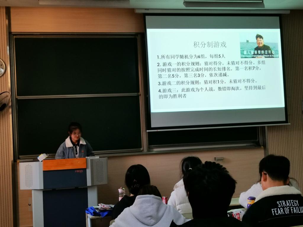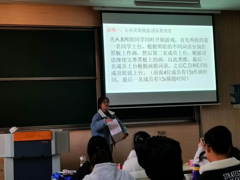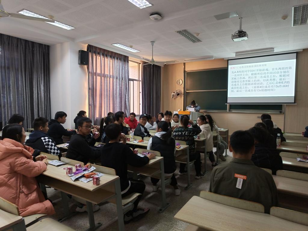 本次班会以积分制游戏的形式开展,一共分为两个环节,全体同学随机分为6个小组,团队作战。首先,第一个环节是“心有灵犀”,每个小组先派出一位同学抽题后由四位同学在黑板上作画,最后一名同学根据画的内容猜题。以每组猜题时间长短进行排名,并给予相应积分。活动中,同学们相互配合,通力合作,在搞笑轻松的氛围里逐渐放开自己,慢慢消除彼此间的距离感。