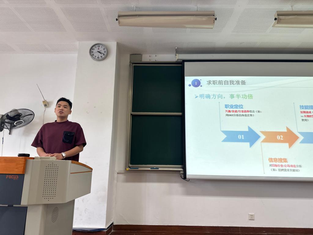 签约无锡药明生物股份技术有限公司的王子玉,向同学们分享了求职前的自我准备、投递渠道与策略、简历的撰写技巧和面试通关秘籍。他强调,要针对求职岗位在简历中突出个人经历与能力,要注重信息收集,关注企业官网,避免高峰期,用Excel记录追踪,整理投递进度。他还为同学们推荐了简历投递平台,分享了如何利用网络资源查找面试模板与避坑指南。