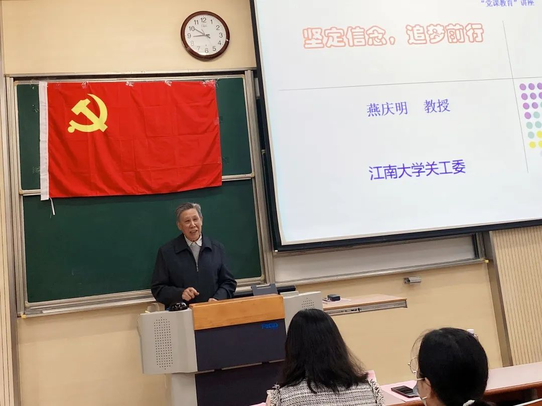 紧接着校关工委副主任、电子信息专业教授燕庆明老师为本次培训做《坚定信念、追梦前行》的首场讲座。讲座内容围绕建党伟业、百年发展征程以及燕教授在学习党史中的一些体会展开。燕教授还与大家分享了他写的诗——《红船起航》、《水调歌头•学党史》、《水调歌头•回首感悟》等,或讲述了中国共产党建党初期的艰难历程,或浓缩了中国共产党全心全意为人民谋幸福所取得的成就,或展示了他本人学习、工作的峥嵘岁月。讲座的最后,燕教授引用习近平总书记对青年人的寄语呼吁同学们:“一要爱国,忠于祖国、忠于人民。二要励志,立志鸿鹄、做奋斗者。三要求真,求真学问、练真本领。四要立行,知行合一、以行求知。”燕教授深入浅出,真诚恳切的讲座使同学们受益匪浅,掌声雷动。