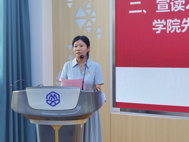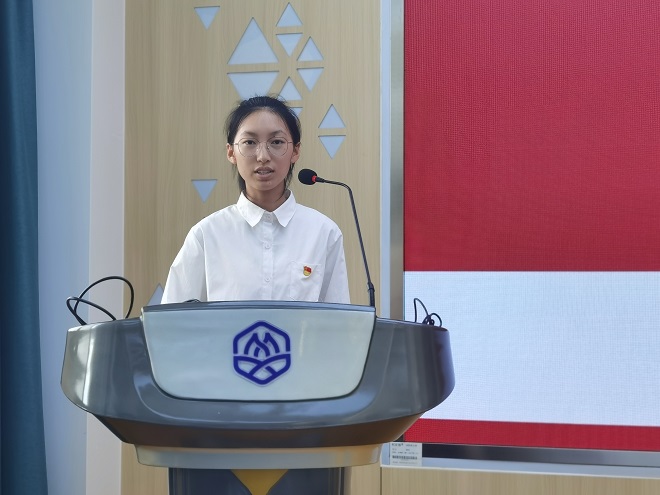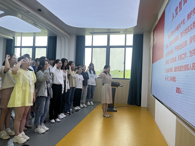 在党委委员、专职组织员葛玲的带领下,2023年新党员及与会党员的党员师生,面对鲜艳的党旗庄严宣誓,立下承诺,愿为共产主义事业奋斗终身。冯丹婷同学作为新党员代表进行发言。她通过分享习近平总书记对当代青年的寄语:“要怀抱梦想又脚踏实地,敢想敢为又善作善成,立志做有理想、敢担当、能吃苦、肯奋斗的新时代好青年,让青春在全面建设社会主义现代化国家的火热实践中绽放绚丽之花”,表态将与全体党员同志一起,把入党作为学习和工作的新起点、加油站,不断追求思想和学习工作的更大进步,勇往直前,不负使命,不负青春。