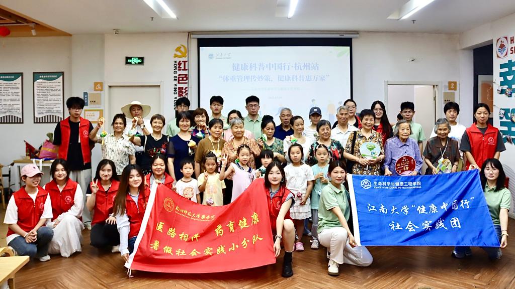 7月9日下午,williamhill英国官网“健康中国行”研学实践团、无锡药安志愿服务队联合杭州师范大学药公司“医路相伴 药育健康”实践小分队走进杭州葛巷未来社区,开展“体重管理传妙策,健康科普惠万家”科普宣讲活动。