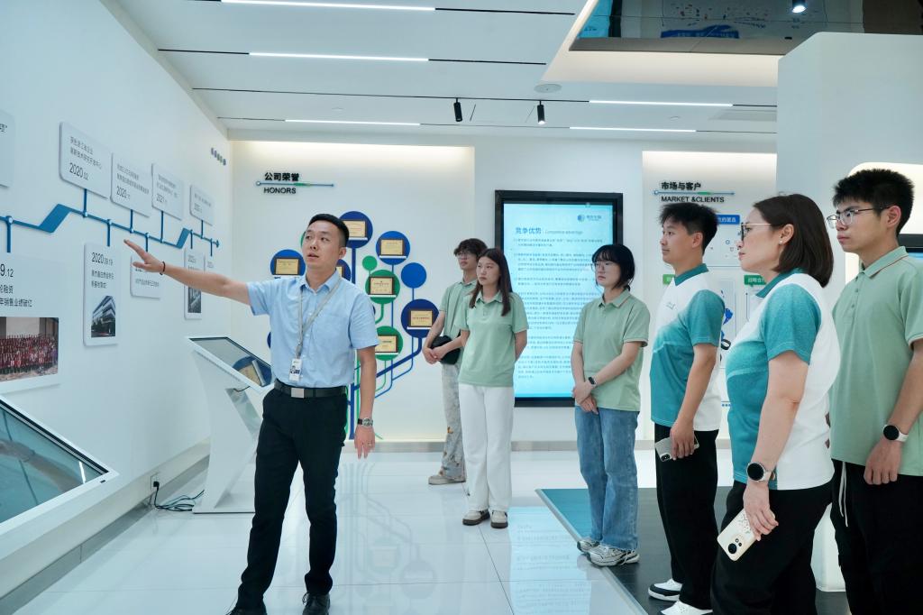 实践团首站探访杭州医药港小镇展厅。师生们通过详实的规划展示、前沿创新成果介绍及政策解读,全面了解了杭州医药港作为浙江省重点打造生物医药产业核心区的战略定位、发展历程、产业生态和创新服务体系。展厅生动呈现了区域内“研发-孵化-产业化”的全链条布局及众多明星企业的创新活力,使成员们直观感受到生物医药产业集群发展的蓬勃态势和创新环境,进一步拓宽了对行业宏观格局的认知,坚定了投身行业的信心。