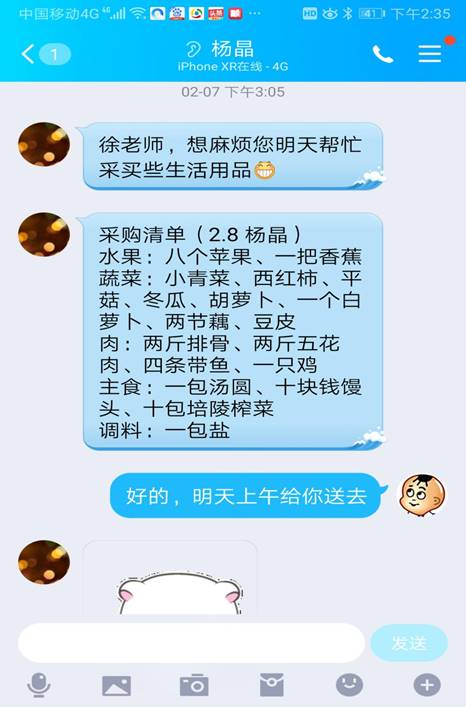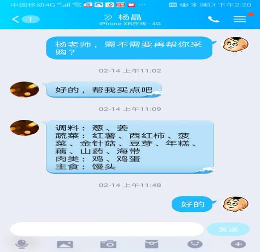 公司青年教师杨晶,她们一家2月6日下午由安徽老家返回无锡,住在公司请教公寓。2月7日上午给杨老师发了消息,下午杨老师给我发来了生活物资采购清单。我一看,嚯,还真不少!水果、蔬菜、主食、肉类、调料等近二十种。由于当天较晚了,只好第二天去采购。