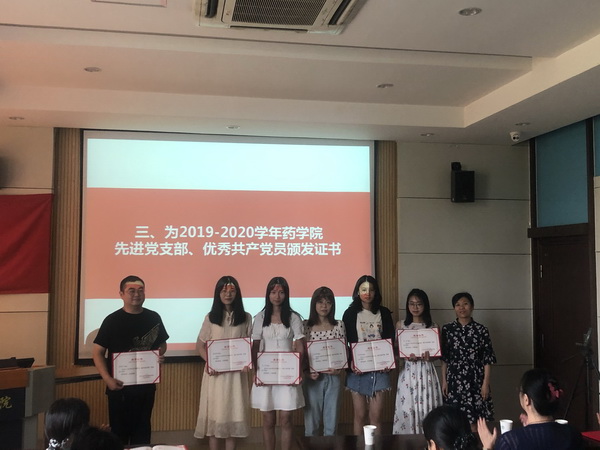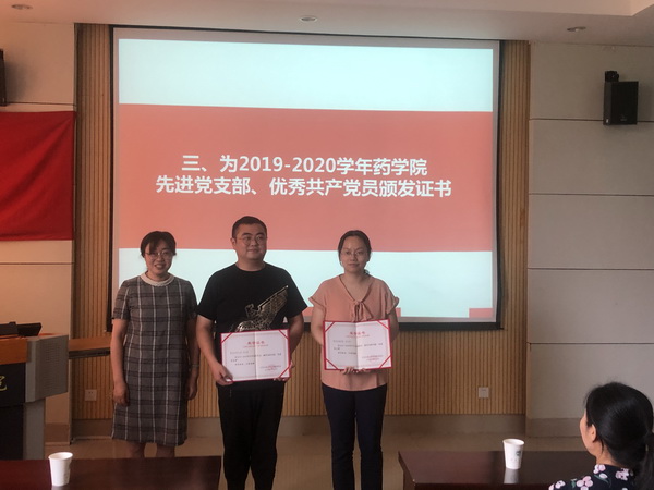 大会着重对2019-2020学年药公司“先进党支部”、“优秀共产党员”进行了表彰。经各党支部民主推荐、参照年度考核评优成绩,由党委会讨论决定,药公司教师第一党支部和研究生第一党支部荣获“先进党支部”荣誉称号,蔡燕飞、吴浩等11位师生党员获“优秀共产党员”荣誉称号。公司党委书记陈霞雯和副经理李会分别为先进党支部和优秀共产党员获得者颁奖。