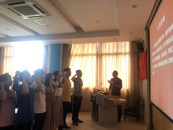 随后,在公司党委委员巩凯同志的带领下,11名在校新党员面向鲜红的党旗,高举右拳庄严宣誓并在入党誓词上郑重签名。短短八十个字是党员对党的庄严承诺,也代表着对党最忠诚的决心。与会的师生党员也重温入党誓词,不忘初心、牢记使命。会议的最后,党委秘书顾峻老师对毕业生党员进行了党员组织关系转接教育。她从党员组织关系转接的含义、要求、注意事项等方面展开剖析,并结合毕业生的实际情况展开讲解,让毕业生党员清晰地了解自己党组织关系转接的各项要求。