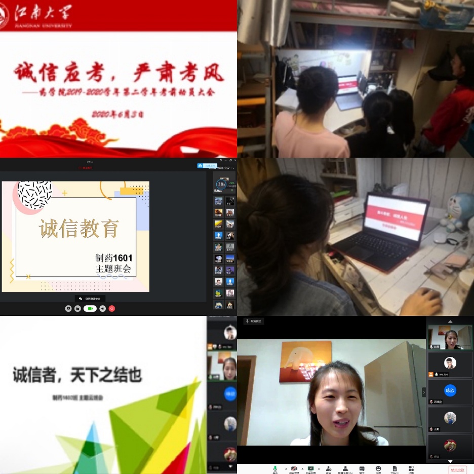 6月3日,药公司组织本科年级全体同学依托企业微信平台开展了“奋斗青春,诚信人生”主题云班会活动。2017、2018、2019年级分别开展了有关考风考纪的考前诚信动员班会,2016级各班班主任带领班级同学分别从学术研究、日常生活和毕业离校三个方面展开讨论。