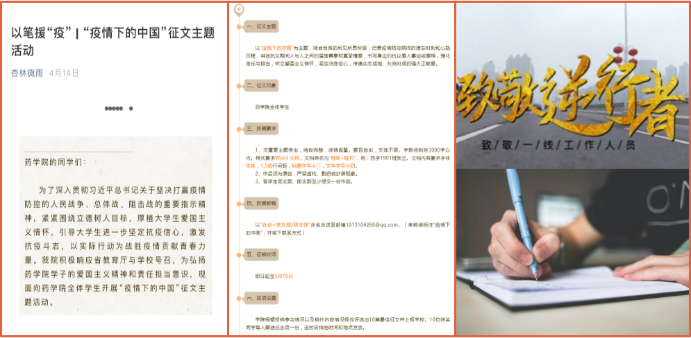 为弘扬药公司学子的爱国主义精神和责任担当意识,4月14日-5月30日期间,药公司以“共筑诚信,你我同行”为主题面向全体员工开展了“疫情下的中国”、“逆境携行,你我同心”等一系列征文活动。鼓励员工通过征文展示自己坚定目标、坚持不懈、重信守诺的品质,从而传播诚信能量,增强诚信意识。公司各员工团支部、党支部依托网络平台积极参与主题征文活动,涌现出一批充满真情实感的优秀征文。优秀征文作者之一的韩朝宇同学写到“如今新时代的我们,仍将怀揣梦想,勇于担当,鉴定信念的走下去。只有坚持不懈、重信守诺,我们才能够面对残酷的考验、战胜疫情”。本次征文活动结合疫情实际,提高了同学们的文学素养,同时激发了同学们对诚信品德和诚信精神的传承,培养了同学们诚实守信、爱国爱校的优秀品质。