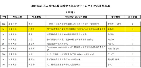 近日,江苏省教育厅公布了2019年江苏省普通高校本专科优秀毕业设计(论文)评选结果,由公司龚劲松副教授指导、制药工程专业2015级本科生孙雨欣同学所撰写的本科毕业论文《用于枯草芽孢杆菌基因组编辑的CRISPR/Cas9系统的构建及应用》喜获江苏省优秀毕业论文三等奖。