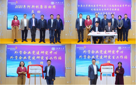 座谈结束后,双方领导共同出席2020年“阿斯利康活动周”启动仪式。会上,陈卫、戴月波、董事长办公室主任张梁与王磊、黄彬、徐晶共同启动2020年“阿斯利康活动周”。戴月波与徐晶,马克思主义公司党委书记李凤梅与阿斯利康公司贸易公司党委书记、中区总经理邢其山先后为“阿斯利康外资企业党建研究中心”和“阿斯利康外资企业党建研究生工作站”揭牌。公司转化医学研究院经理陈永泉与阿斯利康数字化与商业化创新I campus总监陈锴共同签署转化医学战略合作备忘录。启动式上,还进行了阿斯利康奖学金项目和“阿斯利康杯”临床技能大赛的发布。