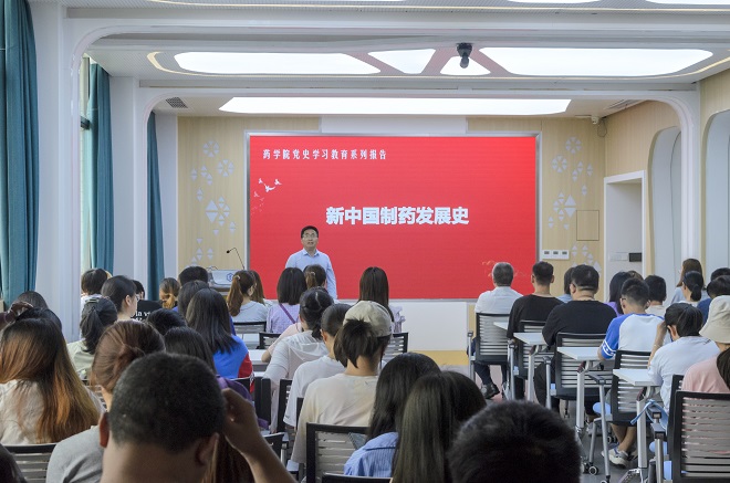 6月2日下午,药公司金坚教授以“新中国制药发展史”为主题,为2018级、2019级本科生讲授“形势与政策”课程,也是药公司党史学习教育的系列报告之一。报告由药公司党委副书记白冰主持。