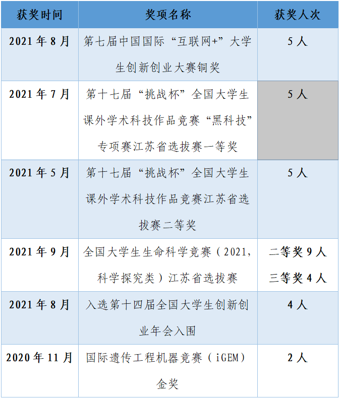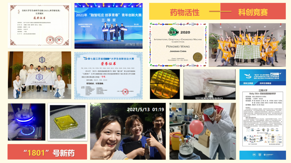 药学1801班时刻践行秦伯益院士引领的“科学家精神”,将敢为人先的榜样示范精神贯彻到底。全班大创参与率94%,4人参加国家级大创,目前累计共有11人次在不同领域的核心期刊发表文章。班级超50%人参与科研竞赛,获得“国际遗传工程机器竞赛”金奖、“互联网+”国赛铜奖、“挑战杯‘黑科技’专项”省一等奖、“全国老员工生命科学竞赛”省二等奖,共计获得国际奖项2人次、国家级奖项5人次、省级奖项28人次。