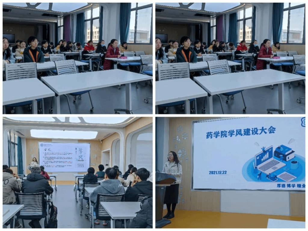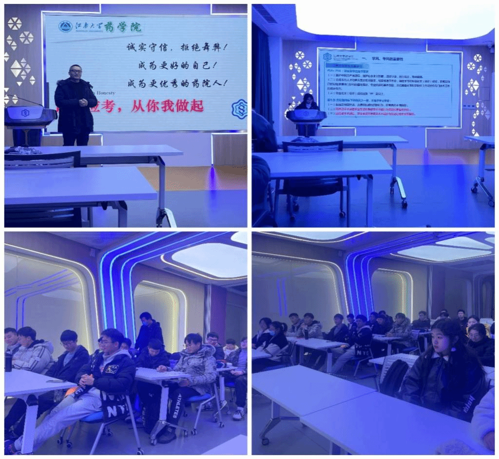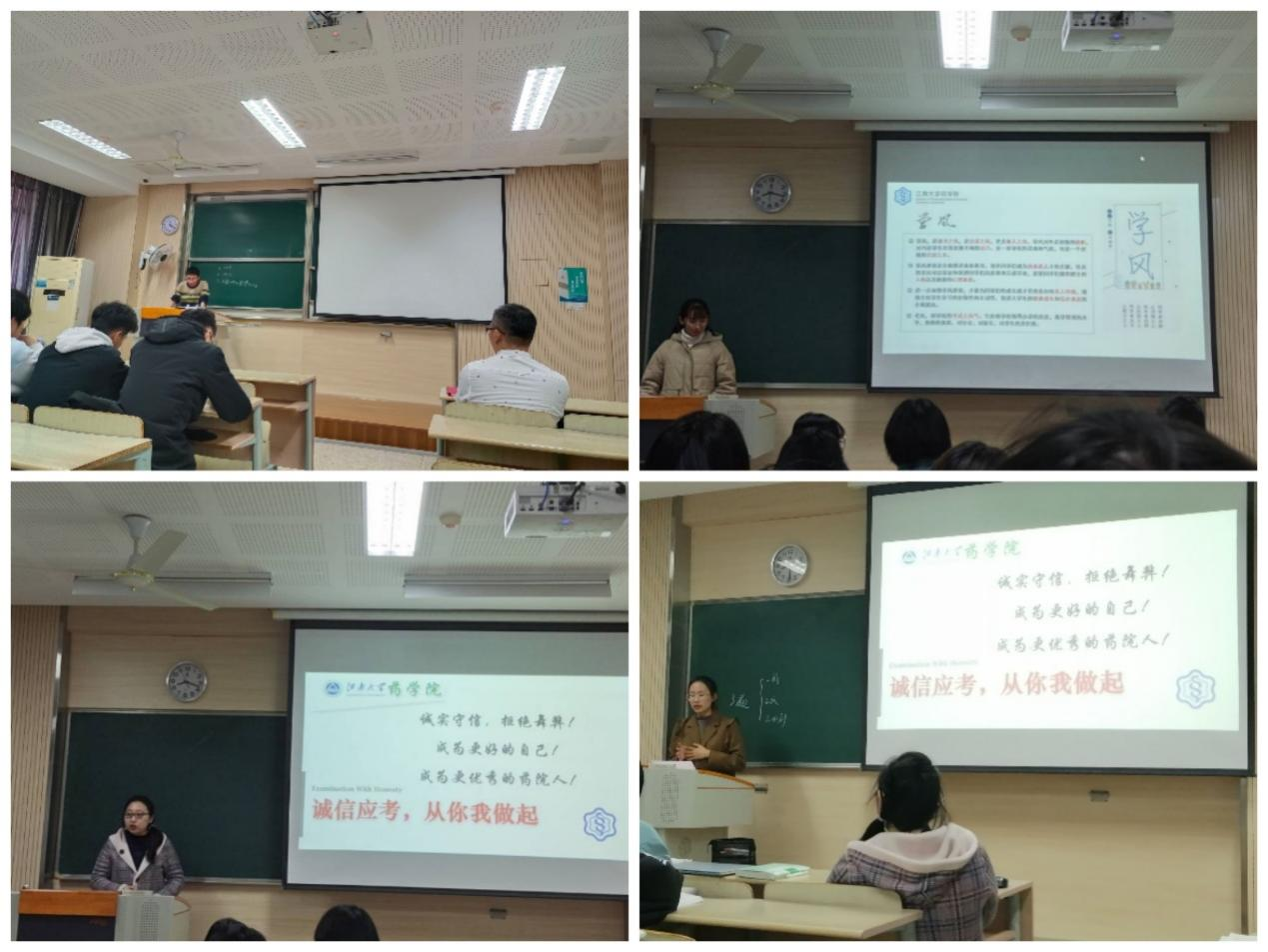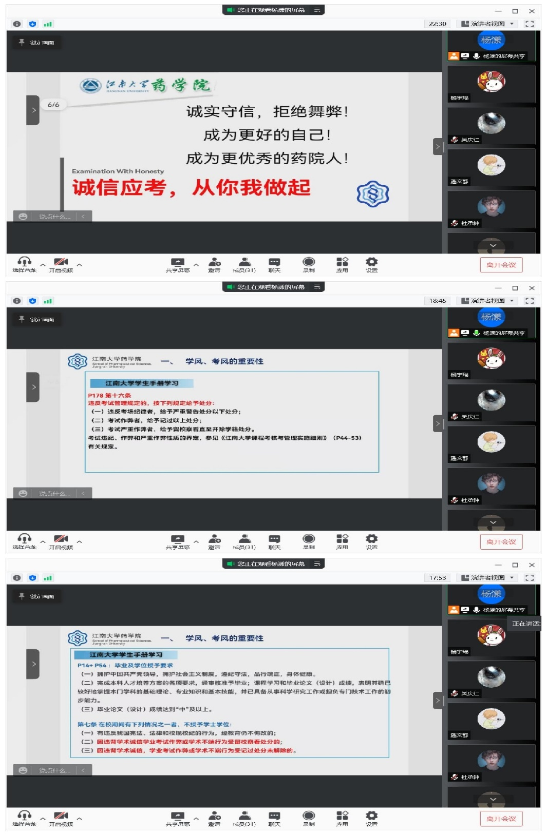 班长韩鑫霞讲解了药公司学风建设大会相关内容:学风,学风建设及考风的有关内容,江南老员工学习手册;毕业及学位授予要求,违反考试规定给予相应处分,什么行为将被视为考试严重作弊,贾础宁同学向大家陈述了自己对考风考纪的理解。制药2102班邀请了班主任吴湘娟老师进行考风考纪教育,进一步补充了员工考试守则;高思诺学姐分享了对往年考试的理解与经验。在会议最后环节,全班签署诚信应考书。大家都对诚信考试有了更深的理解,也对自己有了更高的要求。相信大家都会诚信考试,考出自己的最佳水平。