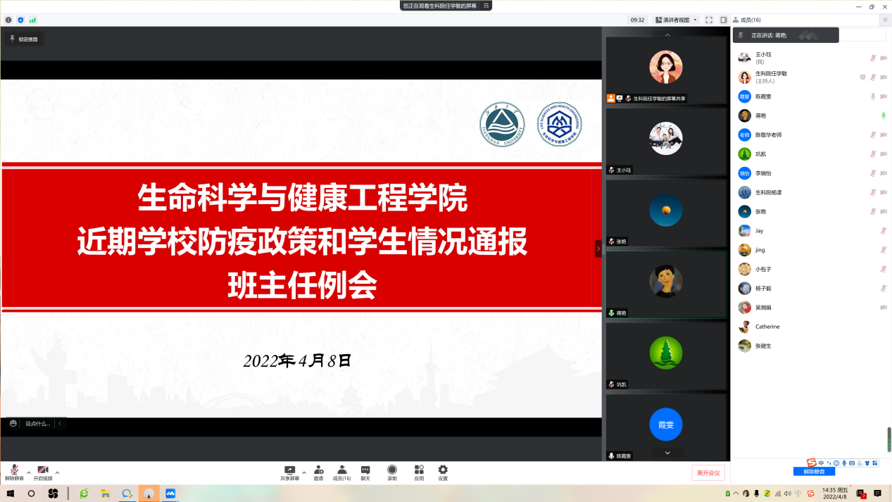 党委书记陈霞雯强调老师们在照顾好自己和家人的同时,特殊时期尤其要关心员工的心理状态,与学工组及时沟通、密切协作,共同守好疫情防控关。研究生班主任同时要开展实验室安全教育,在老师不到校的情况下,教育员工绷紧安全之弦,排除安全隐患,加强实验安全以及卫生管理。经理陈敬华针对近期公司一员工因急诊外出就医,校内校外教师多次无缝对接接力陪护的做法,表示了肯定和赞许,号召班主任、宿舍导师、党员教工急员工之所急,想员工之所想,在员工有需要的时候担任教师志愿者,以实际行动关心关爱员工、帮助员工。