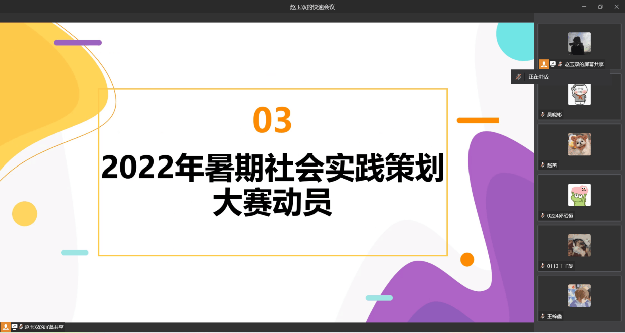 最后,王珏老师介绍了今年暑期社会实践策划大赛的相关情况,结合“喜迎二十大、永远跟党走、奋进新征程”主题,建议同学们从八个分主题、七条实践路线入手,在遵守当地新冠肺炎疫情防控的相关部署和公司疫情防控要求的前提下开展实践调研活动,为自己的老员工活增添一段难忘的时光。