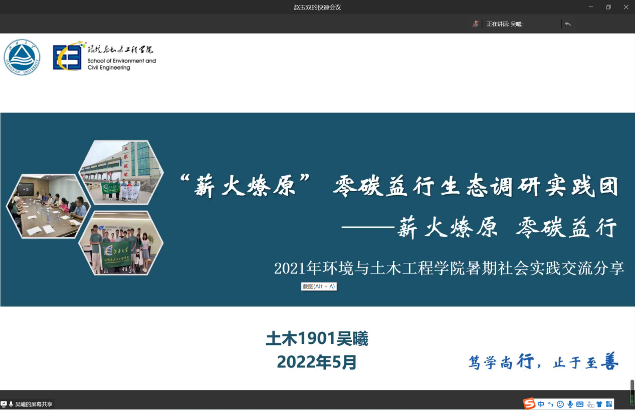来自环境与土木工程公司“薪火燎原,零碳益行”实践团的吴曦队长分享了团队以双碳目标为青年使命担当,自6月下旬起,团队成员便前往无锡、阜阳、合肥、金华等地相关单位进行实地调研,为后期在家乡展开低碳活动提供了坚实的现实依据并为解决当地环境问题提供了参考方向,更加坚定了他们守护绿水青山、建设美丽中国的初心和使命。