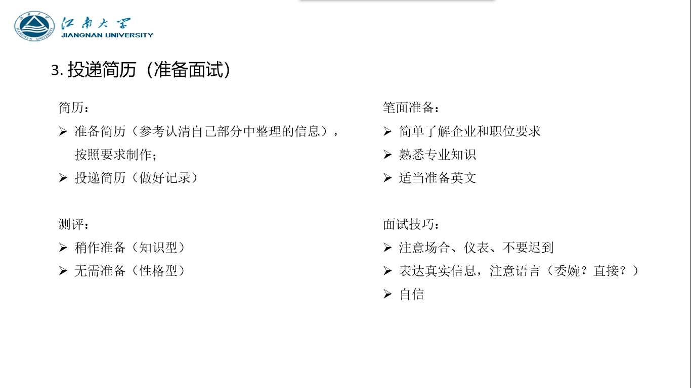 接下来郭良雨从认清定位,职位调研,投递简历和工作取舍四个方面为大家做分享。郭良雨强调,在找工作前要认清自己的定位,在求职前要充分想好自己的个人情况、求职意向和求职状态,明确自己的目标。坚定下来后,就要进行职位调研,辨别信息的真实度。在简历制作方面,郭良雨提醒同学们简历需要简洁明了,员工工作经历、科研经历和学习成绩等招聘公司关注的信息需要重点突出。除了简历这一关,有关笔试和面试环节如何准备等内容,郭良雨更是将他了解到和经历过的所有信息都和大家进行了有针对性的分享。最后,郭良雨提醒同学们在面对多个OFFER时要学会取舍,没有OFFER时要调整心态。