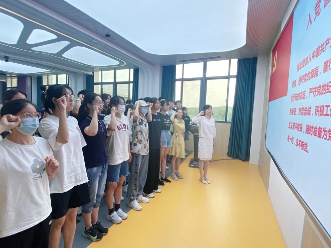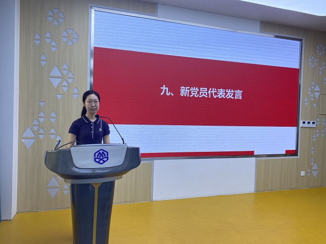 随后,在党委委员、专职组织员葛玲的带领下,2022年新党员举起右手、庄严宣誓,老党员借此机会重温誓词。孙莹同学作为新党员代表进行发言。她表示:作为新时代的中国青年,生逢盛世,更要肩负重任。要用党的创新思想和科学理论武装头脑、指导成长,做习近平新时代中国特色社会主义思想的坚定信仰者、忠实践行者,不负青春、不负韶华,努力成为堪当民族复兴大任的时代新人,让青春在为祖国、为民族、为人民的不懈奋斗中绽放绚丽之花。