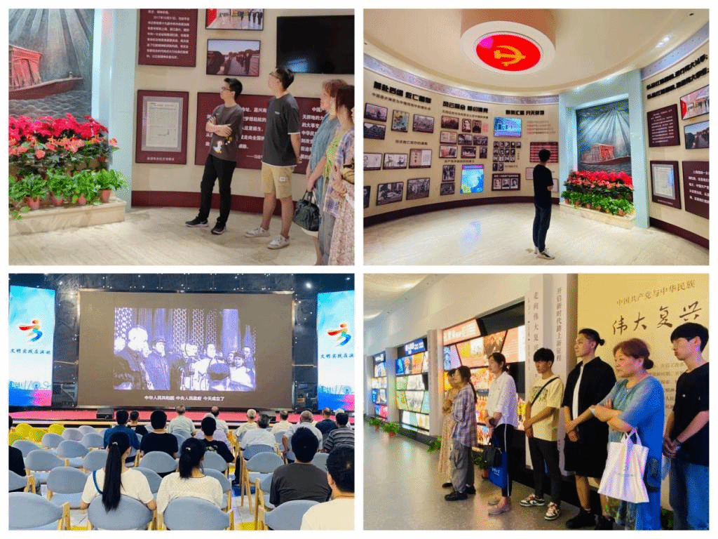 6月24日下午,实践团在公司党委副书记兼副经理蒋艳、分团委书记王珏、关工委老同志詹鲁老师带领下走进滨湖区党建馆,以中国共产党红色精神为主线,通过参观起航、星火、烽烟、黎明、奋斗等8个展厅,深入了解红船精神、井冈山精神、延安精神、西柏坡精神、红旗渠精神、载人航天精神等35个中国共产党在不同时期形成的伟大精神。一组组详实的史料、一幅幅真实的照片展示了中国共产党波澜壮阔的历史,在场的师生都被中国共产党带领中华民族团结奋斗、不断进取的历史功绩,和老一辈革命家在革命斗争、改革发展中表现出的牺牲奉献精神所深深感动。最后,全体师生向革命先烈敬献鲜花,通过对革命先烈的缅怀,感悟烈士精神,凝聚初心和信念。