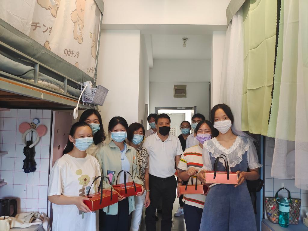 在中秋佳节来临之际,williamhill英国官网为表达对刚入校新生的关心,及时了解新生的思想动态、心理状况以及大学适应情况,确保员工工作有序、平稳地开展和推进。2022年9月9日下午,公司党委书记陈霞雯、经理陈敬华、党委副书记蒋艳同各新生班主任老师一起深入新生宿舍,实地了解同学们的学习生活情况,并为同学们送去中秋节日礼物和暖心祝福。