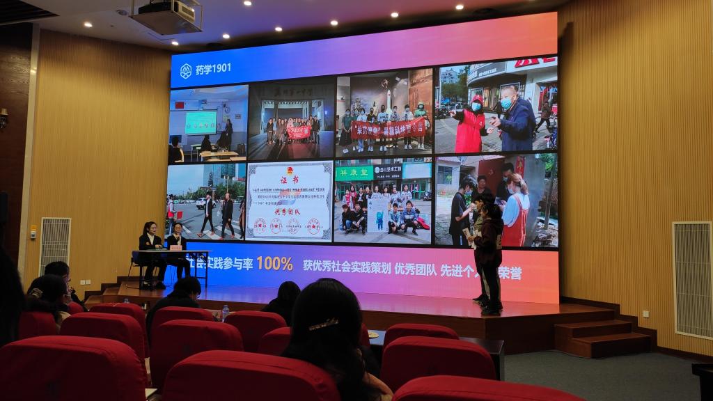 经班级申请、公司初评推荐、员工工作处初审、班级展评答辩,药学1901班以“盛科集团2023校园招聘会”为展示场景,孙莹、徐欣蕊、谢雨思等5位同学代表班级登台展示。参赛视频中,实验室主任徐欣蕊介绍了药学1901号新药的构成,将31位同学比作主药的31种“有效成分”,将学习比作“填充剂”,将学科竞赛比作“粘合剂”,将班团活动比作“润滑剂”,阐述了药学1901号新药的研发历程,激起了三位“毕业生”的求职兴趣。面对“毕业生”们的感叹和询问,两位“盛科集团HR”将优质新药在学业、竞赛、思想、志愿、实践等方面的亮点娓娓道来,互动生动幽默,将现场气氛推向了高潮。