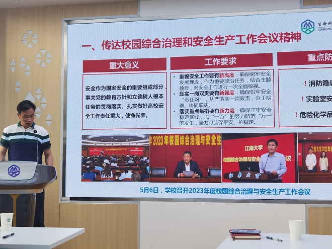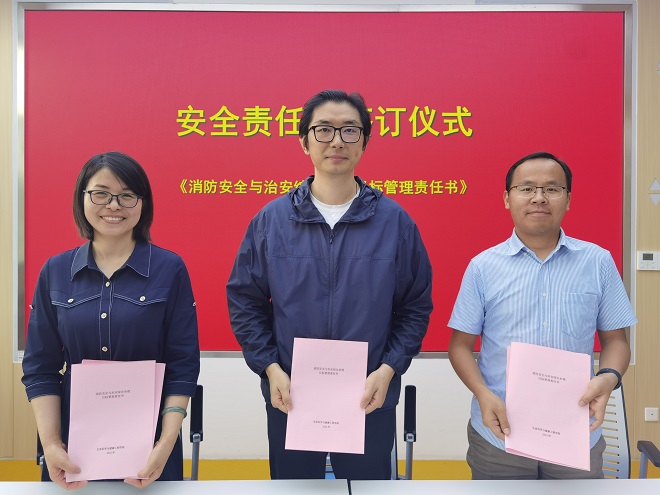 史志洪传达了公司校园综合治理和安全生产工作会议、实验室安全工作会议精神以及实验室安全检查回头看整改要求,要求各实验室认真落实公司安全会议精神,坚决扛起责任,认真落实整改,确保各项安全工作落实到位。会上还进行了2023年公司与各实验室《消防安全与治安综合治理目标管理责任书》、《实验室安全责任书》签约仪式。