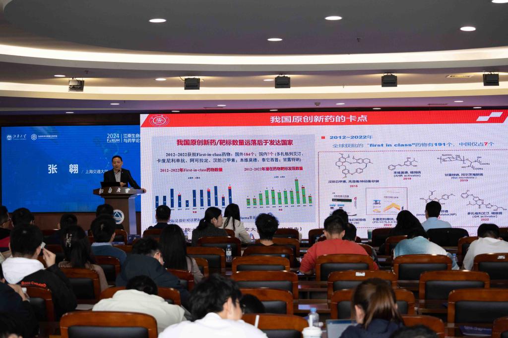 论坛特邀浙江大学临床药学研究中心主任、国务院学位办药学学科评议组成员曾苏教授、上海交通大学药公司经理张翱教授、深圳大学药公司经理程永现教授、南方医科大学药公司经理毕惠嫦教授、中国药科大学药公司副经理(主持工作)吴照球教授、暨南大学药公司经理张冬梅研究员、沈阳药科大学制药工程公司经理刘洋教授等7位专家做学术交流。内容涉及基于药酶和转运体调节机制的临床药学转化研究、消化道肿瘤靶向药物研究、中医治则治法赋能中药药效物质发现、核受体PXR在肝脏疾病的新⻆色、锌指转录因子生物学新功能研究与靶向药物发现、周细胞-抗肿瘤新靶标、创新药物研究及绿色制药工艺的实践等领域。会场气氛热烈,报告精彩纷呈,站位高、观点新,开阔了大家的视野,为江大生科院的师生们呈现了一场学术的饕餮盛宴。