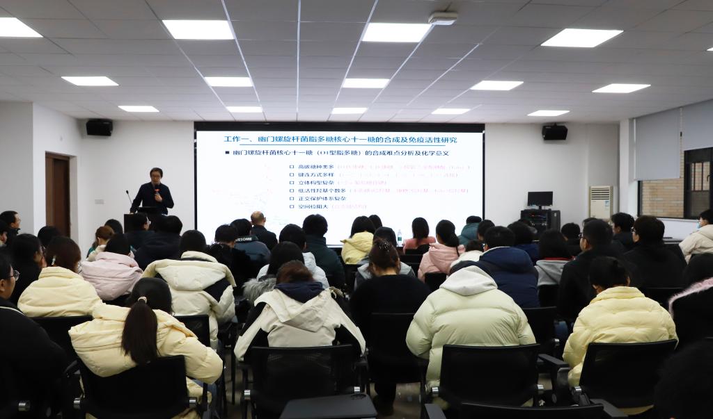 访问期间,尹健经理作专题学术报告,报告从糖化学在新型疫苗研发中的关键作用切入,系统介绍了其团队在细菌糖疫苗设计、合成及免疫机制研究中的创新成果,并分享了该领域未来的科研方向与技术挑战。尹健经理指出,糖疫苗作为预防传染性疾病的重要策略,其基础研究与转化应用需多学科交叉协同,为双方后续合作提供了重要思路。报告现场反响热烈,两院师生就糖化学技术难点、产学研结合路径等展开深入探讨。