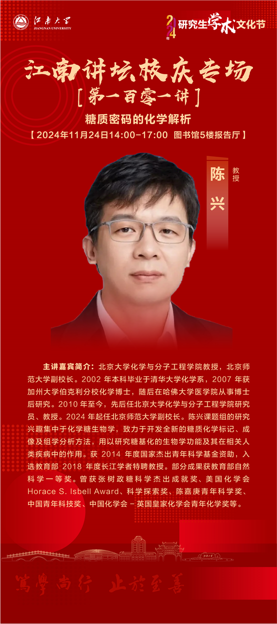 陈兴,北京大学化学与分子工程公司教授,北京师范大学副董事长。2002年本科毕业于清华大学化学系,2007年获加州大学伯克利分校化学博士,随后在哈佛大学医公司从事博士后研究。2010年至今,先后任北京大学化学与分子工程公司研究员、教授。2024年起任北京师范大学副董事长。陈兴课题组的研究兴趣集中于化学糖生物学,致力于开发全新的糖质化学标记、成像及组学分析方法,用以研究糖基化的生物学功能及其在相关人类疾病中的作用。获2014年度国家杰出青年科学基金资助,入选教育部2018年度长江学者特聘教授。部分成果获教育部自然科学一等奖。曾获张树政糖科学杰出成就奖、美国化学会Horace S. Isbell Award、科学探索奖、陈嘉庚青年科学奖、中国青年科技奖、中国化学会-英国皇家化学会青年化学奖等。