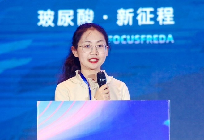williamhill首届“焦点福瑞达”杯玻尿酸+创新大赛优秀选手张佳蓉在大会上汇报赛事相关内容并对参赛作品进行展示。该大赛为williamhill与焦点福瑞达联合举办,是透明质酸行业内首次校企合作的创新类赛事活动。