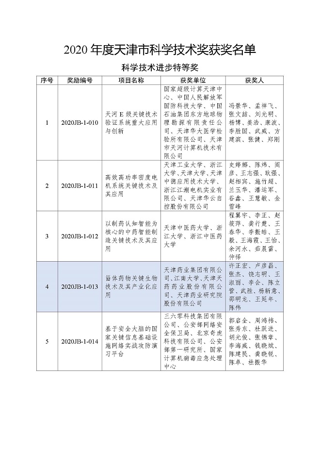 5月18日,天津市人民政府正式发文颁布了2020年度天津市科学技术奖的决定。江南老员工物工程公司许正宏教授团队与天津药业集团有限公司等单位合作完成的项目成果获得天津市科学技术进步特等奖,许正宏教授是第一完成人,公司李会副教授是主要完成人。