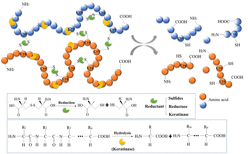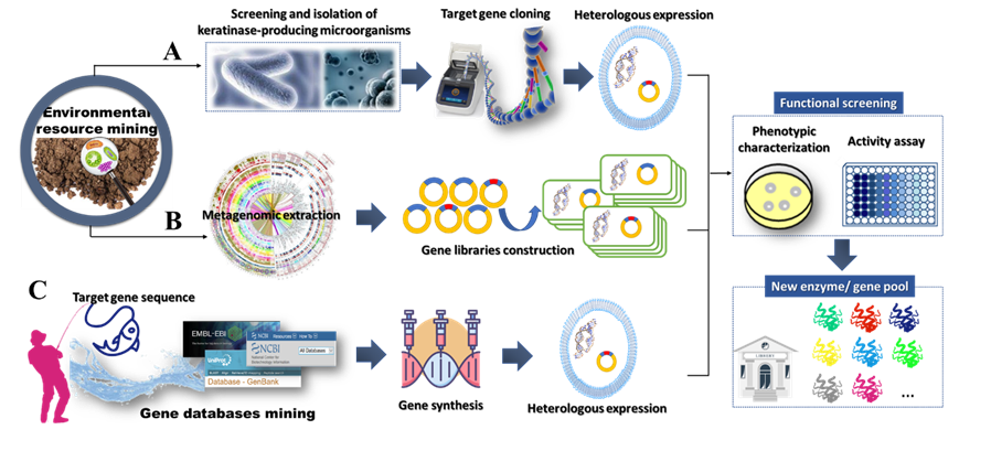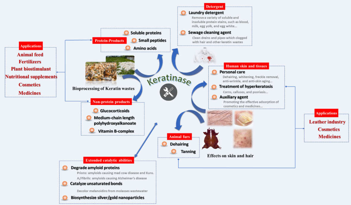 角蛋白酶是一种特殊的蛋白水解酶,能特异性降解结构高度顽固且不溶的角蛋白质,如羊毛、羽毛、人发等。作为养殖业和畜牧业的主要副产物,全世界每年产生大量的角蛋白废弃物,由于结构紧凑、二硫键含量高而难以处理,通常被焚烧、填埋或直接废置堆放,不仅给环境带来严重污染,也是对角蛋白资源的极大浪费。角蛋白酶的发现和利用有效地解决了这个问题,此外,角蛋白酶在饲料、肥料、制革、洗涤剂、化妆品以及医药领域也展现出广泛的应用潜力和价值。然而,“产量低、活性差、性质弱”一直是角蛋白酶研究的瓶颈问题,严重阻碍了角蛋白酶的工业化生产及应用。分子生物技术的快速发展为角蛋白酶的生产和性能提升提供了强有力的工具。该综述系统总结了角蛋白酶的应用潜力,并探讨了角蛋白酶催化机制;对其分子层面的研究进行了全面阐述,包括对基因序列和蛋白质结构的分析;此外,对角蛋白酶蛋白质工程改造的研究进展进行了综述和讨论,揭示了信号肽和前导肽等蛋白结构域的改造工程已成为提高角蛋白酶产量的重要策略,先进的蛋白质工程技术将推动角蛋白酶的工业化生产并促进其在多个领域的商品化应用。