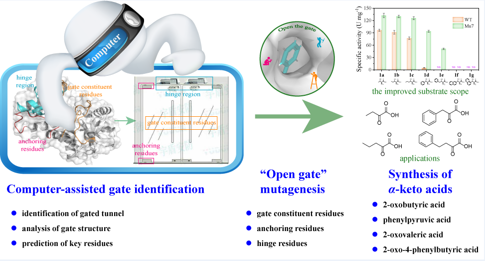 该研究以本团队前期筛选(Nature Communications, 2018, 9:3818)的苏氨酸脱氨酶CgTD为研究对象,首先通过动力学模拟、口袋/通道分析鉴定了底物通道的门控特性。然后根据门控底物通道的结构特征和构成,提出了“open gate”策略以提高酶对大体积底物的催化效率。随后经高通量筛选获得最佳变体CgTDMu7,其底物结合、去质子化和亚胺水解速率均得到有效提升,对苯丝氨酸等大分子底物的催化效率(kcat/KM)提高了90.6倍。最后利用CgTDMu7高效生产了多种高价值α-酮酸,包括2-氧代丁酸(83.4 g·L-1,转化率99%)、苯丙酮酸(72.5 g·L-1,转化率95%)、2-氧代戊酸(21.1 g·L-1,转化率91%)和2-氧代-4-苯基丁酸(29.9 g·L-1,转化率84%)。