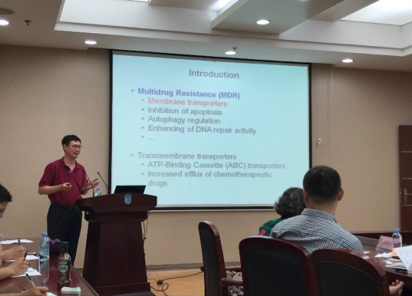 陈哲生教授是美国圣约翰老员工物技术研究所所长,药学系肿瘤药理室主任,主要从事肿瘤耐药机制及其耐药逆转剂的研究,致力于克服ABC运转泵介导肿瘤多药耐药。报告中,陈哲生教授主要介绍了通过体外膜泡运输实验系统和基于细胞的检测系统筛选和鉴定新的ABC转运蛋白抑制剂、ABC转运蛋白家族在敲除小鼠模型中对化学物质(包括致癌物)和致突变物的解毒作用,在场的员工和老师受到极大的启发。