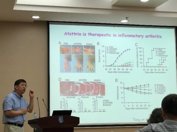 刘传聚,美国纽约大学医公司终身教授,骨转化医学研究中心主任,主要从事关节炎、自身免疫疾病,及溶酶体贮积病的病理学机制及转化医学研究。刘传聚教授在报告中生动的阐述了生长因子Progranulin(PGRN\GEP)通过竞争性结合肿瘤坏死因子受体改善骨关节炎和风湿性关节炎的分子机制,并介绍了他们团队转化医学研究的成果——基于PGRN的有效结构研发了重组因子Atsttrin,该因子能够显著抑制关节炎的发生和进展,具有很好的临床开发前景。参会人员围绕报告内容,就PGRN蛋白的结构、功能和Atsttrin的临床应用前景等内容与刘教授进行了深入的交流,整个过程问答踊跃、气氛热烈。