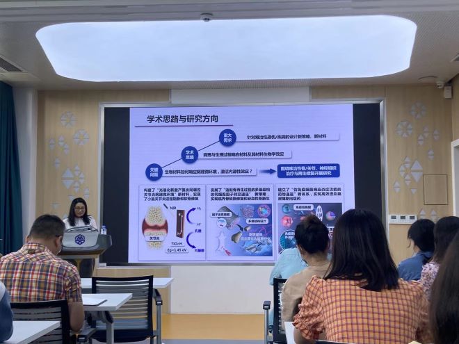 唐为博士长期从事生物医用材料与材料生物学研究,围绕病理微环境响应活性材料设计策略、关键技术开展了系统研究工作。唐为博士与公司师生分享了自己的研究成果,包括光催化释氢新材料重塑关节炎乳酸/自由基过表达病理微环境、适配再生需求的多级结构协同细胞因子时空递送促骨再生和响应炎症微环境的仿免疫细胞功能的递送新体系。其中针对长效释氢骨修复支架重塑衰老微环境这一课题的研究进展进行了详细介绍。整场报告会内容丰富、精彩纷呈,赢得了会场热烈的掌声。