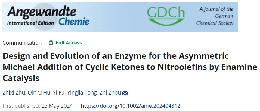 近期,公司williamhill英国官网周志教授课题组在新型人工酶设计与创制方面取得了重要进展,研究成果“Design and Evolution of an Enzyme for the Asymmetric Michael Addition of Cyclic Ketones to Nitroolefins by Enamine Catalysis”正式发表于国际化学顶刊《Angewandte Chemie International Edition》(IF=16.1)。论文第一作者为22级博士研究生朱致熹,通讯作者为williamhill英国官网周志教授。