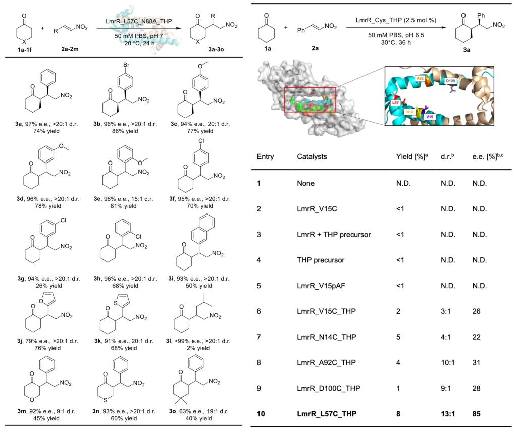 后续作者在LmrR的二聚体间疏水空腔中筛选近20个位点将其分别突变为半胱氨酸,后经二硫键共价修饰引入含有吡咯烷的催化残基,以此构建吡咯烷为催化中心的人工酶酶库。通过酶的理性设计和定向进化,优势人工酶突变体LmrR_L57C_N88A_THP展现出出色的催化效率与立体选择性,展开酶催化底物谱考察,发现进化变体对六元环状酮与各类取代芳基、杂环的硝基烯烃均显示出良好的耐受性,底物谱可拓展性强。酶促动力学研究显示进化变体kcat/KM约为野生型L57C_THP的3.7倍,TTN约为野生型4倍。