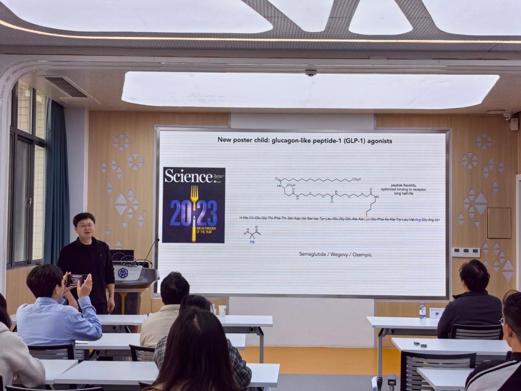 本次报告主要聚焦于在温和条件下,如何巧妙利用简单醛试剂与多肽中的特定氨基酸残基发生反应,实现对天然肽和蛋白质的高效、定向修饰展开。报告伊始,陈教授以两个实际应用案例——用于靶向药物递送的PDC BT1718和用于治疗高胆固醇血症的肽PCSK9抑制剂——为引,详细阐述了复杂糖肽类化合物的有机合成过程。他强调,肽在形成中等大小的三维结构方面存在局限性,主要原因是缺乏有效的结构调节工具,而借鉴自然界中的“环肽支撑”天然产物结构能够克服这一难题。随后,陈教授从反应机理的角度,分享了合成具有独特结构和高通量能力的肽大环的多种化学策略。