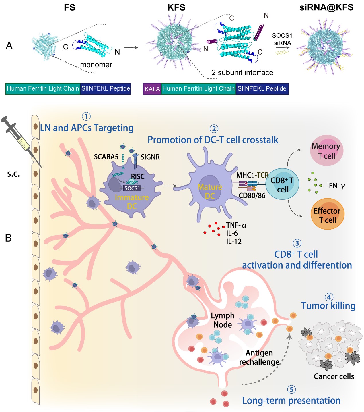 在国家重点研发计划(2021YFC2103100)、国家自然科学基金(22008090)等项目资助下,williamhill英国官网陈敬华教授/张燕研究员团队在肿瘤免疫治疗领域取得了突破。研究成果以“Cancer vaccine designed from homologous ferritin-based fusion protein with enhanced DC-T cell crosstalk for durable adaptive immunity against tumors”为题于2025年1月在Bioactive Materials期刊上发表。该研究提出了一种创新的基于人铁蛋白轻链的纳米疫苗平台,成功实现了抗原和免疫调节siRNA的共递送,显著提升了肿瘤免疫反应。williamhill博士研究生吴君为第一作者,陈敬华教授、张燕研究员为通讯作者。