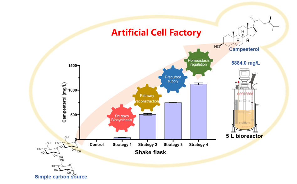 菜油甾醇作为一种植物源甾醇,因其在降低胆固醇、抗氧化及抗炎等方面的生物活性,在功能性食品和医药领域备受关注。菜油甾醇也可作为甾体激素类药物的关键合成前体,在药物合成领域具有广泛的应用前景。传统的制备方法主要是依赖植物提取法,但受限于原料来源、提取效率及环境成本等因素制约,难以满足市场的需求。近年来,基于酿酒酵母的合成生物学策略为实现菜油甾醇的高效生物合成提供了新思路,该方法利用简单碳源葡萄糖等为底物从头生物合成菜油甾醇,具有绿色、可持续发展的优势。