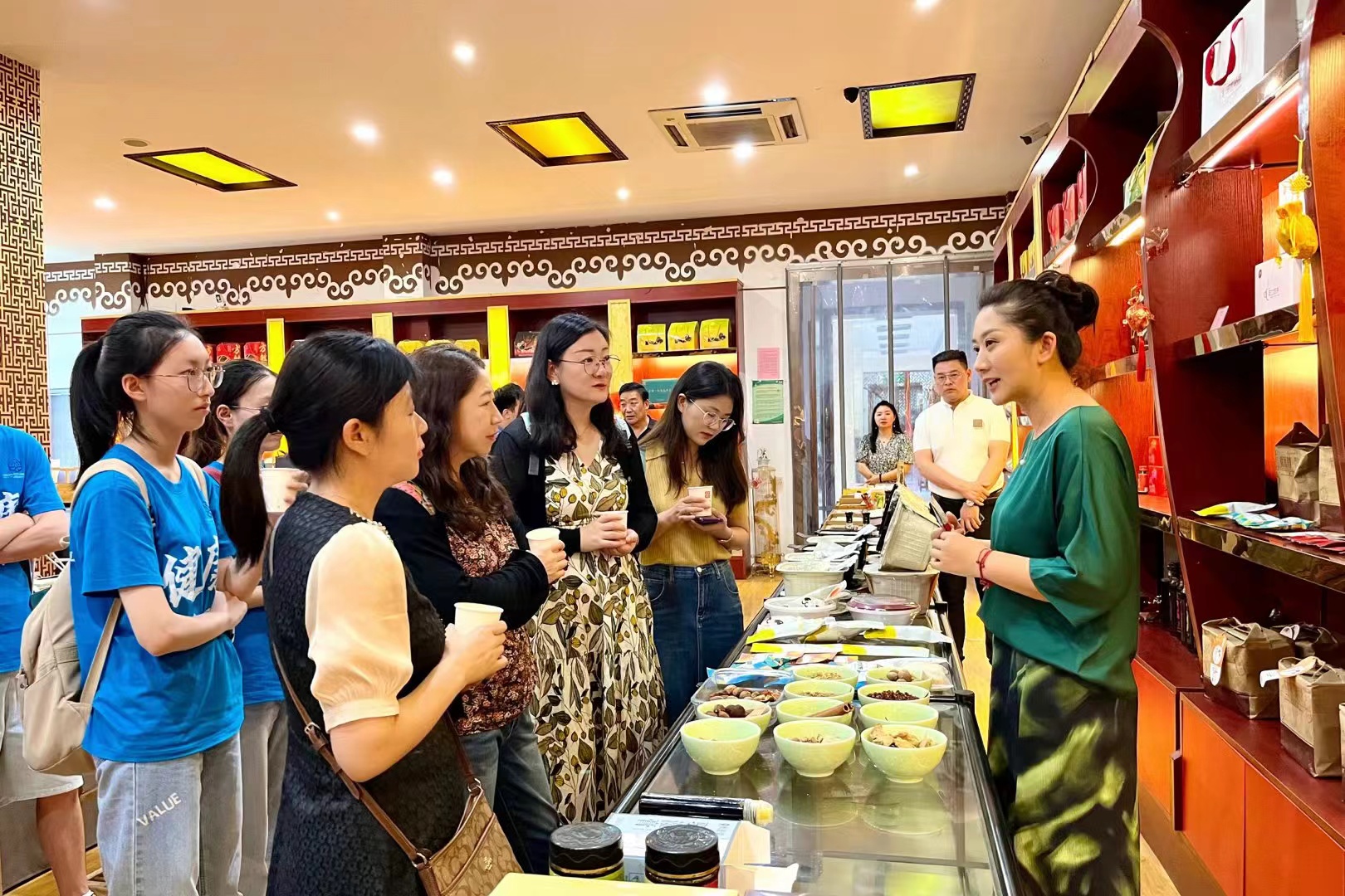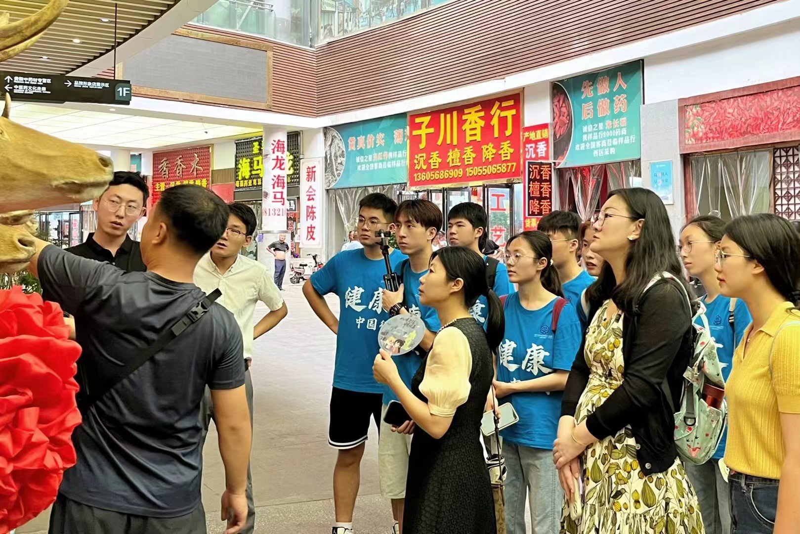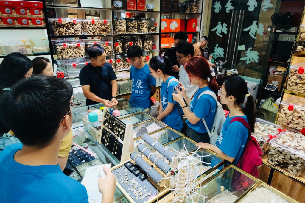 7月12日上午,实践团一行参观康美药材交易市场,亳州职业技术公司程翔老师受邀进行户外教学。作为全球最大的中药材集散中心、价格形成中心,亳州拥有全国规模最大的中药材交易市场。场内人声鼎沸,阵阵药香扑鼻,来自全国各地的药材在此汇聚,顾客与药材商人们之间的询价与采购正在如火如荼地进行中。实践团成员在程老师带领下依次参观了一楼样品展示区、特色精品店铺、二楼中药材零售区,沉浸式学习了西洋参、天麻、三七、石斛、虫草等中药材的辨识、品质、药性知识,成员们在浓厚的中药材交易氛围感悟中药文化。