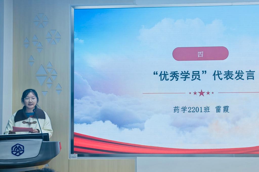 药学2201班雷霞同学代表优秀学员发言,向全体学员分享了个人学习心得。7个月的时间里,她通过集中学习和参访实践提升了理论素养、开阔了眼界视野,表示这是一次“相遇有趣灵魂,碰撞先进思想”的培训、一次“学做标兵骨干,担当时代重任”的培训。她呼吁全体学员将此次培训的所学、所感、所悟充分运用到今后的学习和工作之中,以理想者、担当者、吃苦者、奋斗者的姿态,奋进新征程、建功新时代,跑出当代青年的最好成绩!