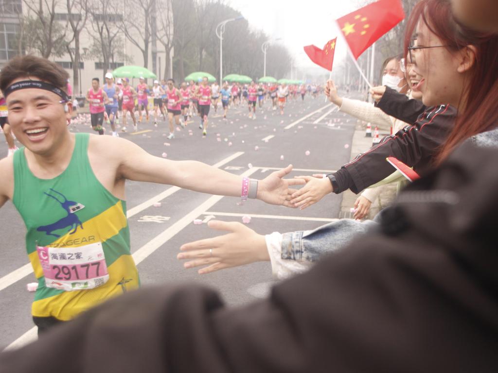 8时28分,名列前茅的精英组运动员率先通过观赛区域,同学们热情高涨,挥舞红旗,奋力呼喊,击掌鼓励。随后,大批运动员不断经过,同学们激情洋溢,拼力呼喊,此起彼伏的加油声,肆意舞动的红旗,不仅展现着运动员在春日阳光下长时运动的坚持,也展现着同学们彼此之间互相支持的和谐璀璨的友谊。汗水代表不轻言弃,呼喊彰显互助之谊。无论是意气风发的运动员,亦或是坚守岗位的志愿者,还是热情洋溢的观赛者,运动的意义在此刻绽放出绚丽之光。