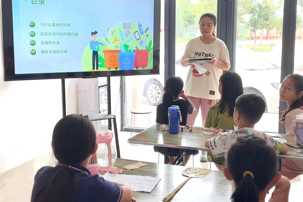 青春盛会,绿色共享。为厚植绿色环保理念,普及垃圾分类原则,实践团队进入荣盛社区,面向小员工群体开展垃圾分类宣讲活动,通过PPT展示、游戏互动等寓教于乐的形式,激发了孩子们的环保热情与责任感,大家纷纷在接力书上画下手印、隔空击掌,共同构筑绿色美丽的家园。