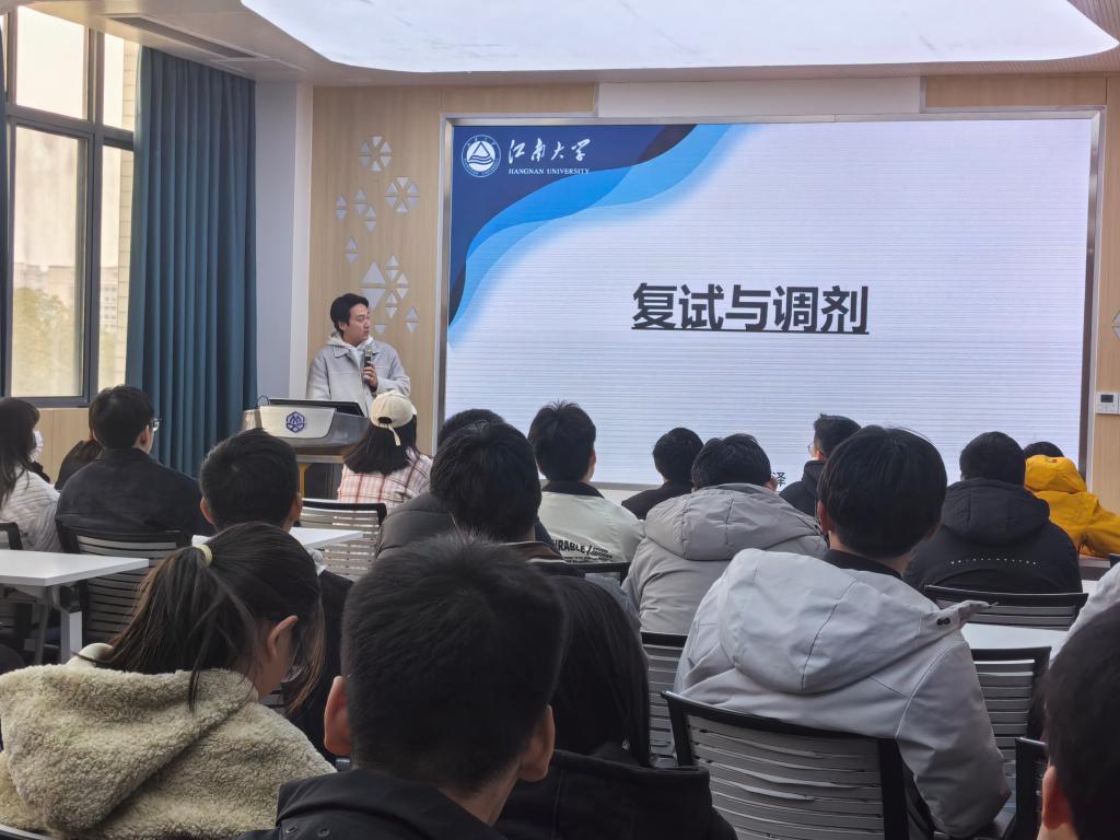 随后,袁泽为同学们分享考研调剂经验。他为同学们介绍了如何判断自己是否需要调剂,如何搜集考研调剂信息,并分享了药学专业相关推荐调剂院校以及面对调剂应该准备工作和资料。袁泽结合自身经历着重分享了面试经验,强调了解生物医药研究前沿及热点问题的重要性,并提醒同学们认真梳理并准备个人科研经历信息。同学们都受益匪浅,备受鼓舞。