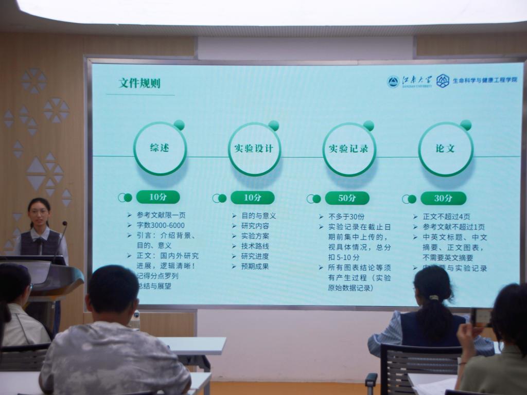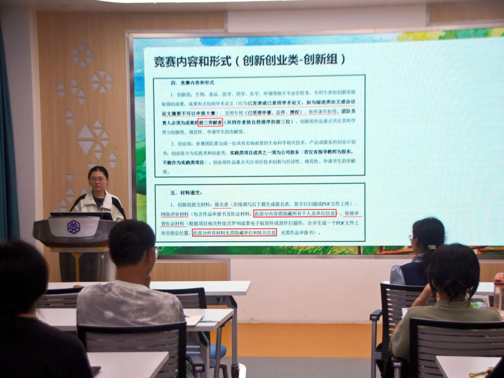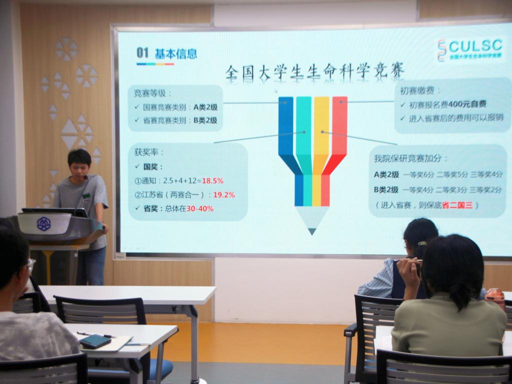 曾获第九届全国老员工生命科学竞赛中斩获国家三等奖(创新创业类)和省三等奖(科学探究类)的王烁从竞赛内容和形式切入,结合创新组和创业组两个赛道的参赛经验,精心补充完善竞赛流程细节,并强调了参赛条件及材料递交的注意点,着重指出竞赛的时间安排和提交流程。如同一位细心的引路人,深化了同学们对竞赛的理解。