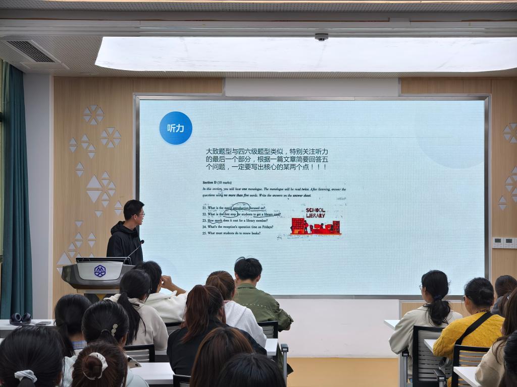 曾获全国老员工英语竞赛二等奖的赵乐岩从竞赛背景、具体题型分布、以及备考技巧三个方面展开,毫无保留地分享了他对大英赛每种题型的独到见解和应对策略,同时指出竞赛时间的紧迫性并提出了“快、快、快”的做题策略。在竞赛备考角度,他也结合个人经历,介绍了可同时准备四六级以及大英赛的方法,合理安排真题训练,找到适合自己的节奏。最后他推荐了相关备考资料来帮助员工提升英语素养,将英语融入日常生活。赵乐岩的分享生动有趣,为同学们的英语学习之路点亮了明灯。