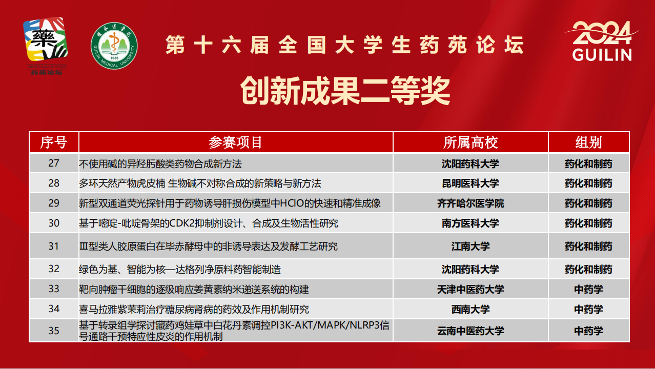 11月23日,由全国药学类院校老员工专业技术与实验技能竞赛组委会主办、桂林医公司承办的第十六届全国老员工药苑论坛在桂林医公司落下帷幕。公司获得药学科学赛道创新成果全国二等奖1项,创造了该项赛事公司的最好成绩。