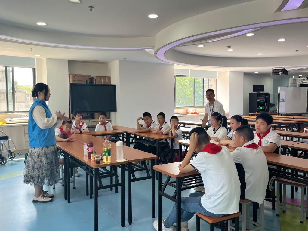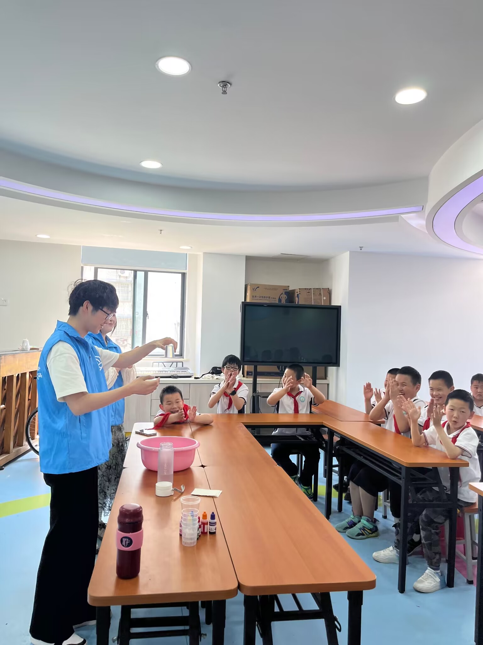 此次活动准备了许多有趣的实验,有橘子潜艇、彩虹雨、神奇的摩擦力、杯子倒放水不流。在同学们的倾心展示下,这些神奇的现象引来小朋友们的阵阵惊呼,在老师的帮助下,他们把实验原理与自己的生活相连接,体会到了实验的乐趣,感受了自然界中神奇的规律。