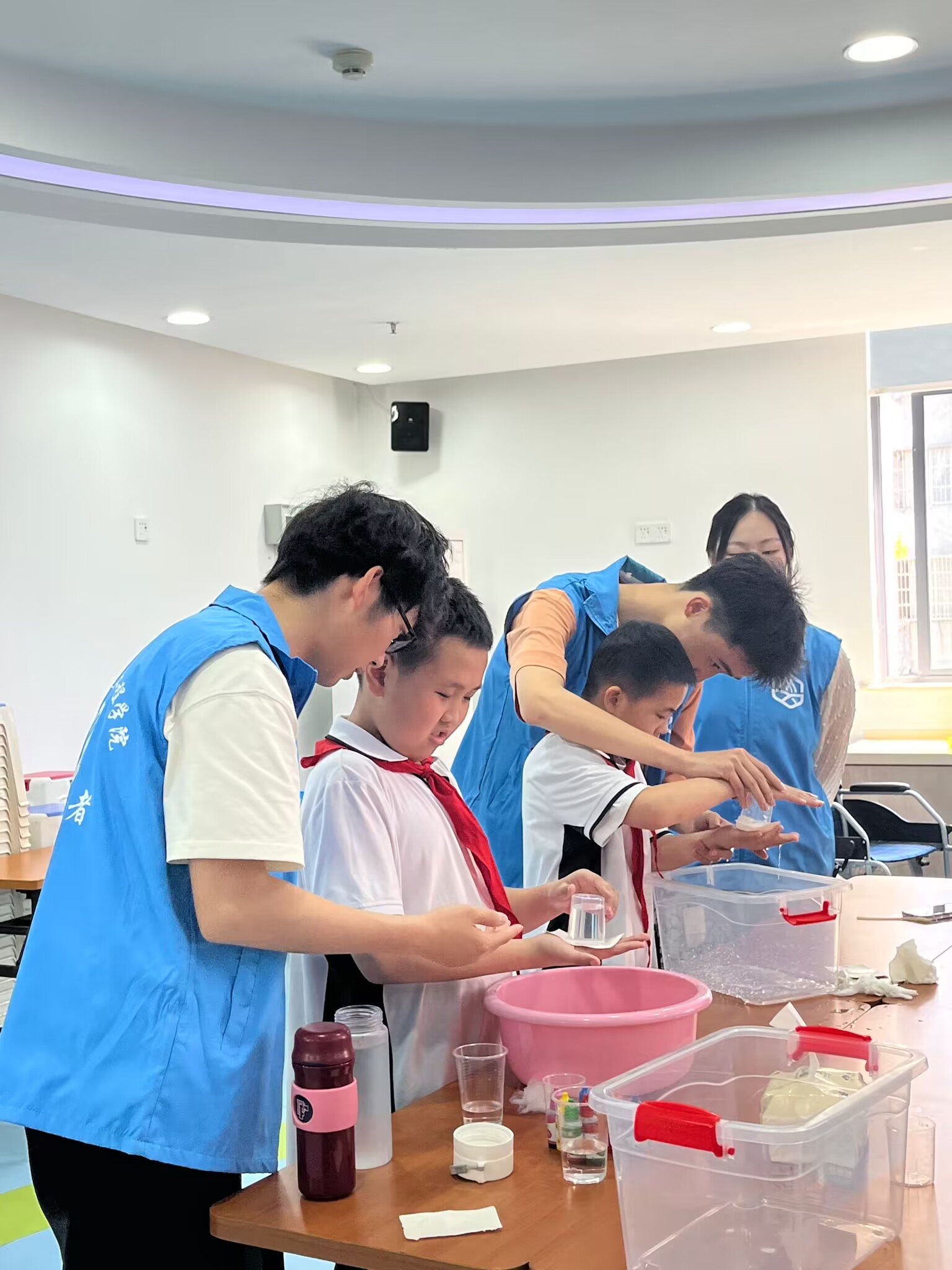 活动在进行到“杯子倒放水不流”时达到高潮。同学们展示后,小朋友们纷纷上台尝试,尽管手紧张到颤抖,但他们从不轻言放弃,一次次失败,又一次次努力,终于,他们成功了,这一刻“星星”的光辉绽放,所有人无不为其鼓掌。
